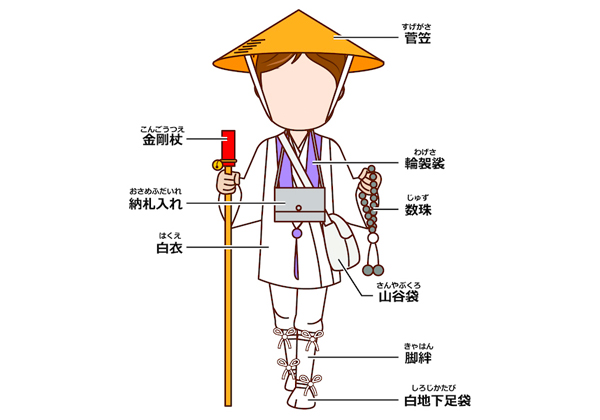 巡礼者の正装です。白は清浄さや、何ものにも染まらない決意を表すとも言われます。また、昔はお遍路が命がけの旅であったことから、道中で行き倒れてもそのまま葬ってもらえるよう、死装束(覚悟の象徴)としての意味合いもあったそうです。